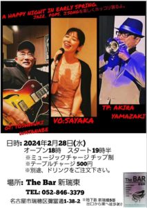 « イベント一覧 このイベントは終了しました。 A happy night in early spring 2024年2月28日 @ 7:30 PM - 9:30 PM « JuNon Duo Live 大槻茂男Presents:30年ぶりの再会!田中タツジ Live » 2024.2.28 19時30スタート 投げ銭制・TC¥500、2ドリンク以上オーダー SAYAKAさんのしっとりとした、大人の歌声、お楽しみに♬ カレンダーに追加 Google カレンダー iCalendar Outlook 365 Outlook Live 詳細 日付: 2024年2月28日 時間: 7:30 PM - 9:30 PM 会場 The BAR 新瑞東 名古屋市 瑞穂区弥富通1-38-2 + Google マップ 電話番号 052-846-3379
